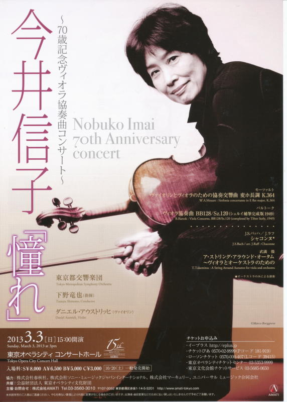 | ★事務局からのお知らせです 今井信子 「憧れ」 〜70歳記念ヴィオラ協奏曲コンサート〜 2013年3月3日(日)15:00開演 東京オペラシティ コンサートホール 入場料:S¥8,000 A¥6,500 B¥5,000 C¥3,000 チケットお申し込み ・イープラス http://eplus.jp ・チケットぴあ ・ローソンチケット ・東京オペラシティチケットセンター ・東京文化会館チケットサービス |