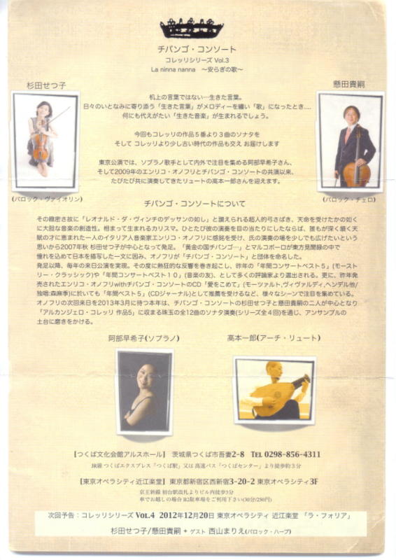 2011年8月21日(日) 13時30分開場 14時開演 新宿オペラシティ3階 近江楽堂 全席自由 3,000円(税込) 後援:日本イタリア古楽協会 チケット販売 新宿オペラシティチケットセンター Tel 03-5353-9999 お問い合わせ チバンゴ・コンソート Tel 03-3407-9921 |