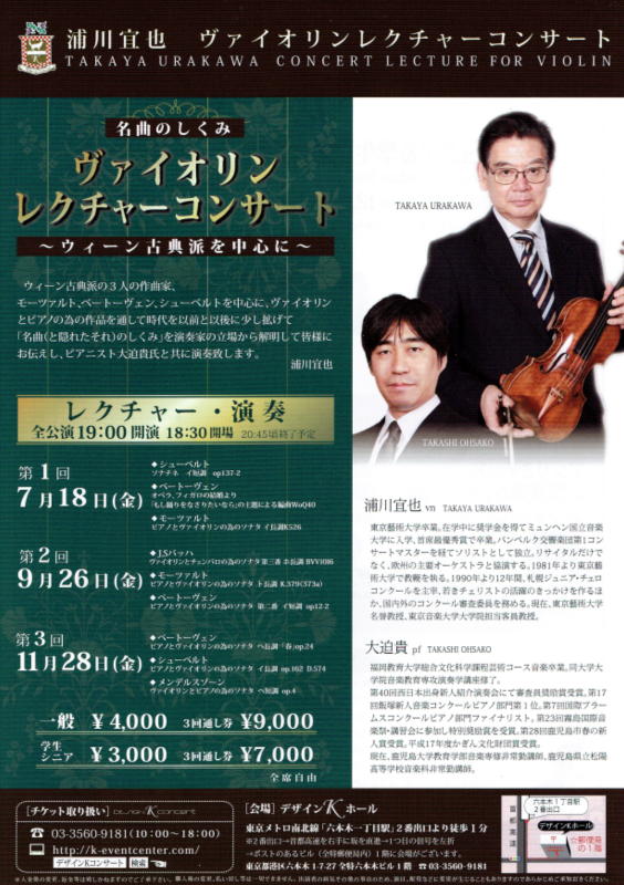 | ★事務局からのお知らせです 浦川宜也 ヴァイオリンレクチャーコンサート 古典派からロマン派へ 全公演 19:00開演 18:30開場 第1回 5月29日(金) 第2回 7月24日(金) 第3回 9月25日(金) 一般 ¥4,000 3回通し券 ¥9,000 学生 シニア ¥3,000 3回通し券 ¥7,000 チケット取り扱い 03−3560−9181(10:00〜18:00) http://k-eventcenter.com/ デザインKコンサート 検索 ← |