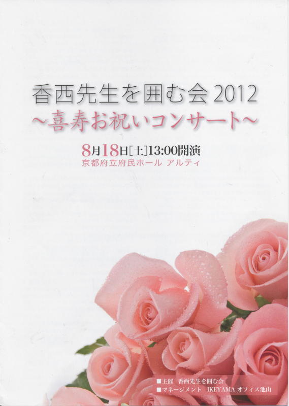 | ★記念会からのお知らせです 2012年8月18日に 香西理子さんの 喜寿のお祝いのコンサートがありましたので、お知らせします。 |