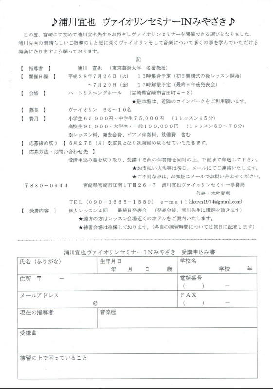 | ★浦川宜也さんからのお知らせです 浦川宜也ヴァイオリンセミナー IN 宮崎 受講者募集のお知らせ |